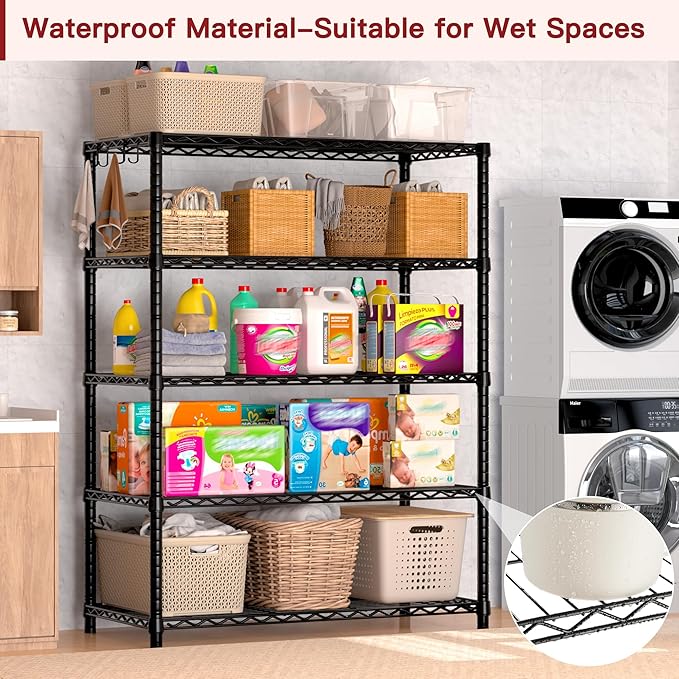 - 【5 Tier Metal Shelving for Storage with Side Hooks】This 5-tier heavy duty storage shelves measures 35.5" W x 14" D x 72" H, providing ample vertical storage space, greatly improving space utilization and making your space look organized. In addition, our wire storage shelving unit comes with 4 hooks for hanging towels, totes, clothes, etc, making reasonable use of more space and improving overall organization