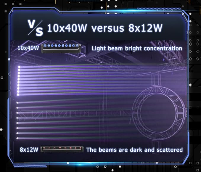 - 【Colorful Stage Effect 】This moving head light bar comes with LED 12W 8 eyes, Red/Green/Blue/White and mixed color, generating beam and dazzling stage effect, which can add a cheerful vibe to your event. Moreover this DJ stage light bar aslo has 180 ° Tilt, 8° lens angle, 9/38 Channels mode, and five advanced built-in program, which can highlight the atmospheres, create the perfect stage effect.