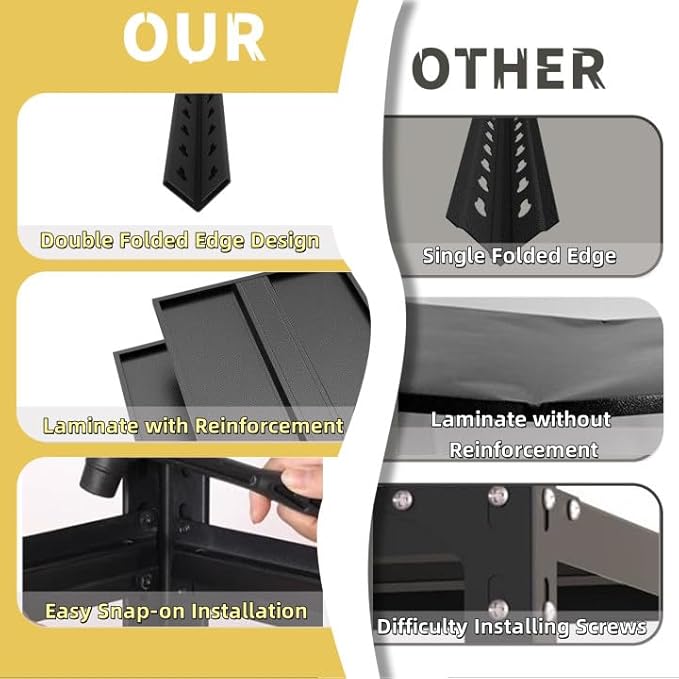 - 【Quick and Easy Assembly】Quick assembly in 10 minutes,we free offer you a hammers and a pair of gloves. There is no nuts or bolts required,you can successfully assemble a heavy duty storage shelf.The heavy duty metal shelving for garage shelves adopts a special interlocking design to make it quickly assembled