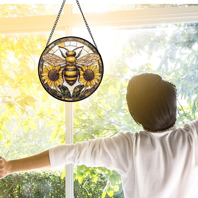 Stained Glass Window Hanging - Bee Sunflower Yellow Suncatcher Ready to Hang Window Doors Home Decoration and Christmas, Mother's Day Birthday Gifts for Women, Men, and Mom 11.8x11.8 in