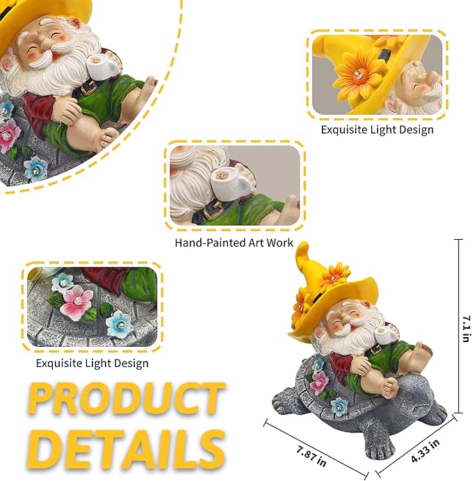 - 【Premium Material and Durable Design】 The garden gnomes outdoor statue is made of high-quality resin material, featuring waterproof, sunproof, and UV-resistant properties, capable of withstanding various harsh weather conditions. The statue is hand-painted, with the sunflower hat on the gnome's head vividly detailed. Holding a cup of coffee and lounging lazily on a turtle, the design is lively and perfect for long-term outdoor use.