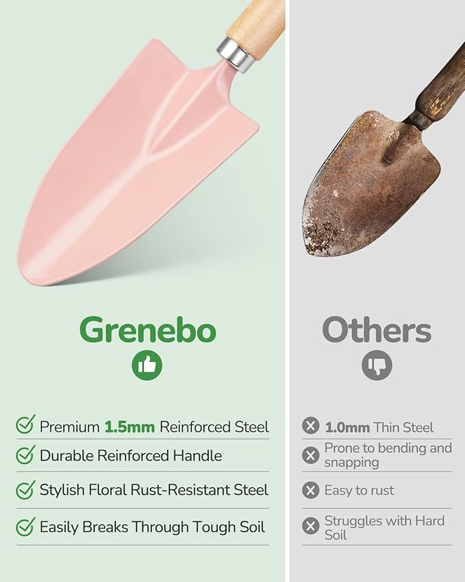 - Built to Last with Premium, Reinforced Quality: Grenebo garden tool set is made from rust-resistant steel with a 1.5mm thickness (compared to standard 1.0mm). We've added snap-on clips and glue-reinforced wooden handles for extra durability. The thick, solid wooden handles offer superior comfort, preventing bending and breaking, and ensuring reliable use season after season.