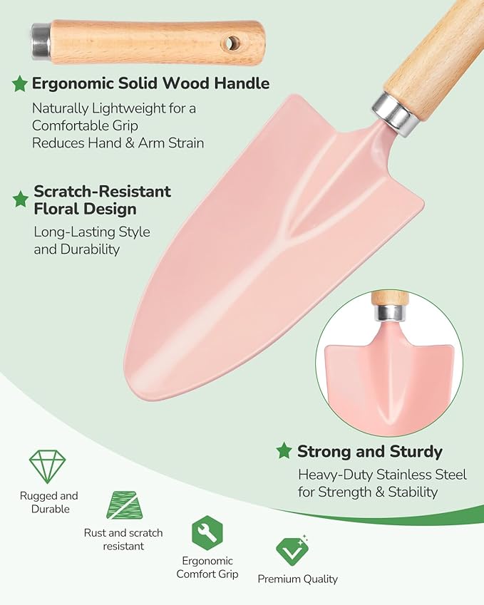 - Ergonomic Handle Design: Our gardening tools are crafted with solid wood ergonomic handles designed for maximum comfort. The natural wooden texture provides a firm yet comfortable grip, reducing strain on your hands and wrists during long hours of gardening. Whether you're digging, weeding, or pruning, these womens gardening tools gift set makes every task easier.