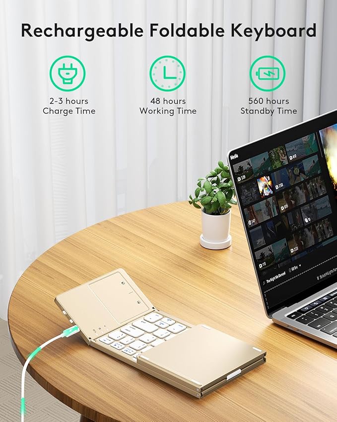 Samsers Foldable Bluetooth Keyboard with Touchpad - Portable Wireless Keyboard with Holder, Rechargeable Full Size Ultra Slim Pocket Folding Keyboards for Android Windows iOS Tablet & Laptop - Gold