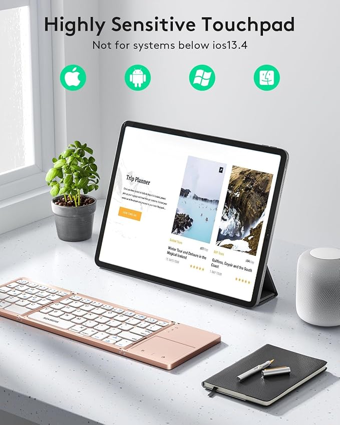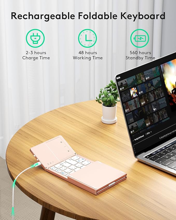 - 【Sensitive Touchpad Foldable Keyboard】Upgrade sensitive touchpad supports mouse left and right key function, so you can control the device without using mouse. Updated richer and more practical multimedia shortcut functions make your work more convenient and more efficient! Built-in rechargeable battery can last for 48 hours or 560 hours after 2-3 hours of charging. One full charge last enough for your short business trip or vacation!