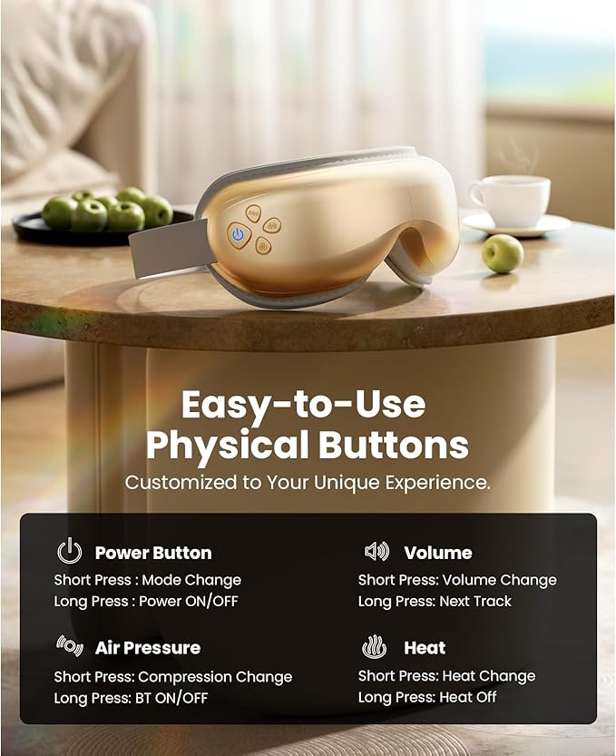 - Quieter Motor & Customizable Music - Our upgraded electric eye care device incorporates low-noise technology reduces audible noise from 60dBA to just 45dBA, so that you can enjoy a low-noise, comfort, warm nap. The built-in white noise music helps to reduce anxiety and can be turned off at your convenience. You can also connect the massager to your phone or tablet to play your own playlist. Simply wear it for 15 minutes before going to bed every night to relax and enjoy a better night's sleep
