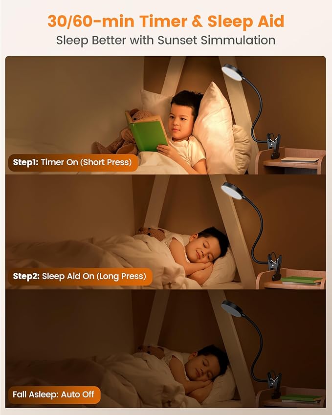 - [3 Color Modes & 5 Brightness Levels] This clip light offers 3 color options: warm 2700K to help you relax, natural 4000K for everyday reading, and cool 6000K to keep you sharp during work. Each color lets you pick from 5 brightness levels, from a gentle 10 lumens that’s easy on the eyes at night to a bright 400 lumens that lights up your space. Pick the right light for any mood or task