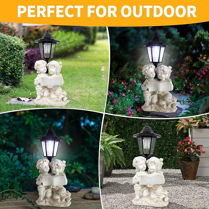 - Funny Garden Decor: This outdoor statue captures adorable boy and girl reading book under a black lantern! The white colours make it look sacred and add an artistic touch to your outdoor space. Reading Angels Figures measures 5.9" L x 4.7" W x 13.4" H.