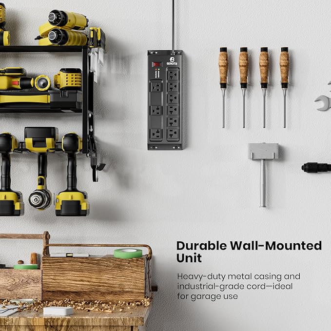 - Wall Mount Heavy Duty Metal Power Strip: Durable Metal Casing with 2 Mounting Holes, Easy to Install on Desktops, Under Tables, Workbenches, or Walls, Suitable for Vertical and Horizontal Setups in Garages, Workshops, and Offices