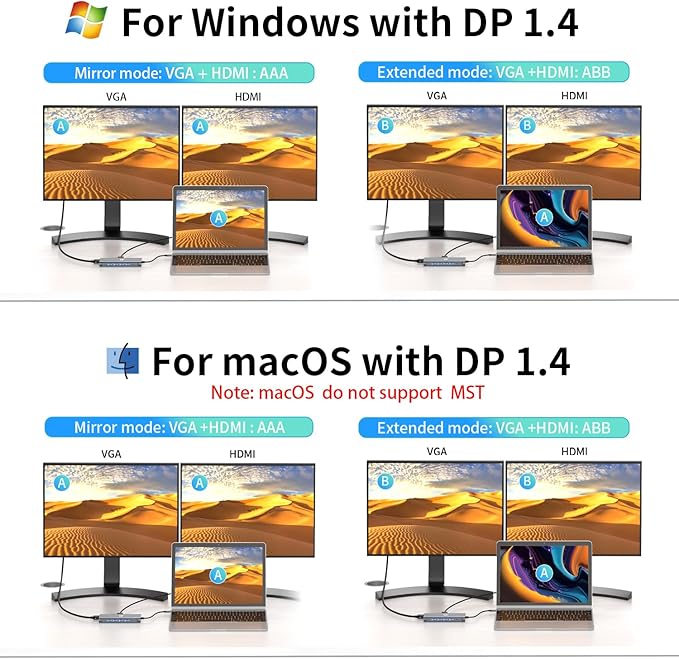 - 【4K@60Hz Ultra HD HDMI & Dual Monitor Support】Experience stunning ultra-HD visuals with 1× 4K@60Hz HDMI output when using a single external display—ideal for professional video editing, graphic design, and smooth 4K streaming. Need more screen real estate? Connect an HDMI and VGA monitor simultaneously for dual 1080P output, perfect for multitasking and boosting productivity.Note: To achieve 4K@60Hz output, your laptop must support DisplayPort 1.4, your monitor must support 4K resolution, and use an HDMI 2.0 or higher cable. macOS supports dual displays in mirror/extend mode but does not support MST (multi-stream transport).
