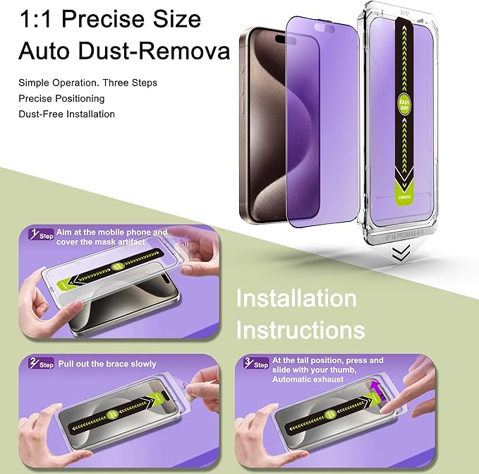 - Auto Dust Removal & Easy Installation: The SY SHANGYAN Anti Blue Light Matte Screen Protector for iPhone 16 Pro Max features advanced auto dust removal and self-aligning technology for a flawless,bubble-free install every time.Just place the frame,pull the tab,and press to push out any air bubbles.Installation is quick,easy,and hassle-free.For best results,watch our step-by-step installation video before applying