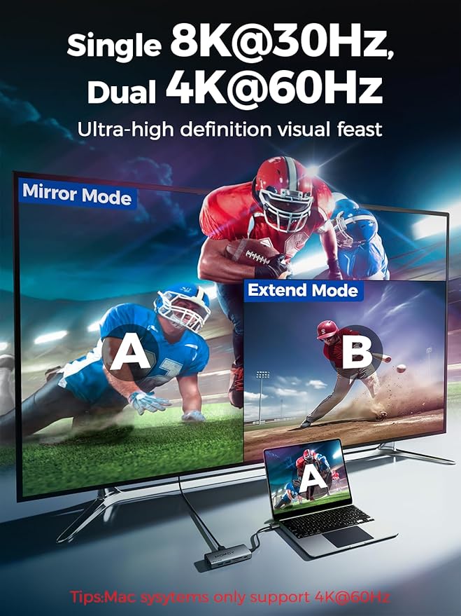 - 【Dual Display Ultra HD Output】The docking station dual hdmi supports single 8K, dual 4K@60Hz mirror/extend modes. Ideal USB C to HDMI adapter for MacBook/Windows laptops. Ultra clear images bring you a visual feast!(Note:1、HDMI1 8K requires DP1.4 protocol PC support (Mac systems only support 4K ). 2、For MAC, the display on both external monitors will be identical.)