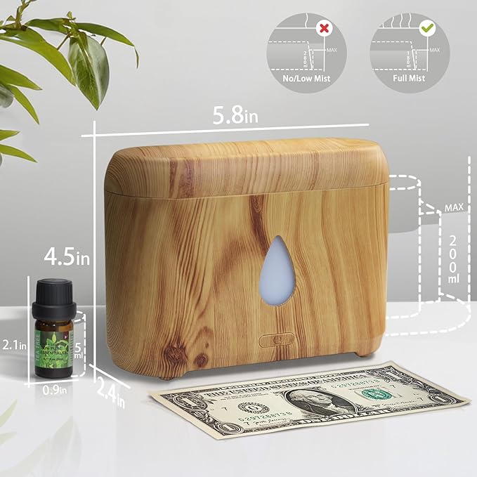 Flame Diffuser for Essential Oils, 200ml Ultrasonic Aroma Diffusers with Cool Mist, Aromatherapy Diffuser with Auto-Off Protection (Wooden Grain(7 Colors), Peppermint+Lavender+Tea Tree+Lemon)
