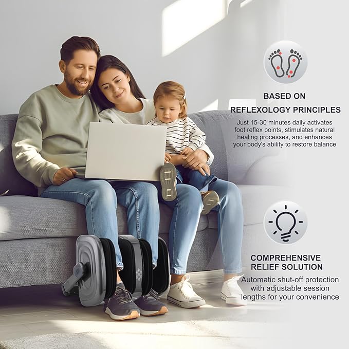 - 【Multifunctional Foot and Calf Massager】The foot massager equipped with 8 airbags units, 2 heating pads, 8 rollers, and 32 nodes. Heat function rolling and deep kneading shiatsu massage providing relaxation for you. Provides a soothing foot massage experience that promotes deep relaxation throughout your body, helping you unwind after a long day and achieve complete comfort.