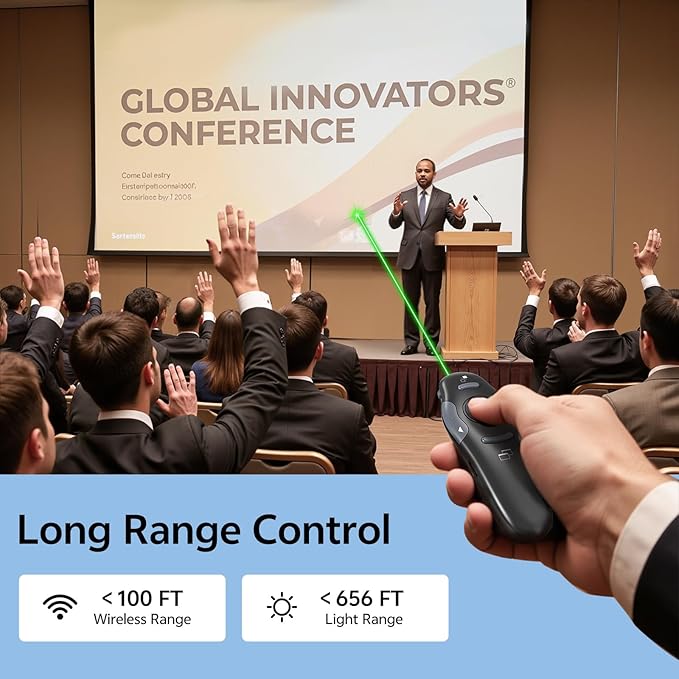- [Bright Green Lazer Pointer] The green laser pointer of presentations can target, accentuate, or draw attention to particular parts of your slides, graphs, pictures, etc. Power point clicker wireless Red Laser Pointer Range: 328FT/100M.