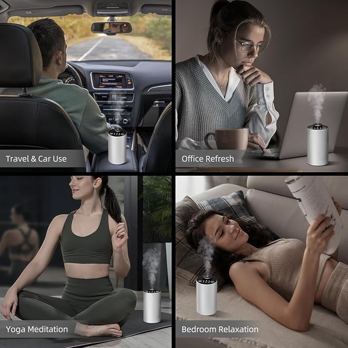 - 【Portable & Versatile Use — Home, Car, Office, Travel】Designed for modern life: Smaller than a soda can, this scent diffuser fits car cup holders, desks, or bags. A handy, cordless, automatic mini machine. Power via USB-C, car charger, or power bank. A full charge delivers 10 hours of continuous use or 48 hours in eco mode. Enjoy spa-like freshness at your desk, calming aroma lavender in the bedroom, or an energizing boost scent during road trips—360° fragrance coverage anywhere