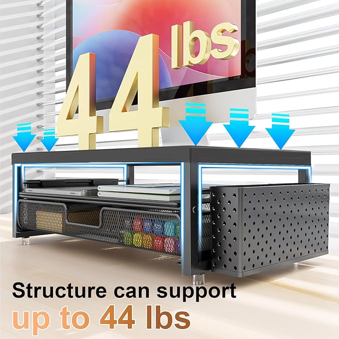 - 【Stable and Durable】The computer stand is crafted from premium wood and high-strength solid steel, delivering exceptional load-bearing capacity. It securely holds up to 44 pounds without wobbling and maintains structural integrity over prolonged use. Featuring adjustable-height feet at its base, this stand ensures steadfast stability on any surface.