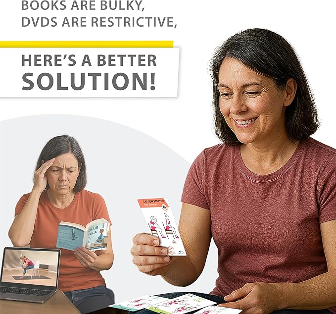 - Ditch the Screen Struggle - No more pausing, rewinding, or struggling to keep up with fast-paced chair yoga DVDs. These self-paced chair yoga cards let you workout anytime, anywhere without relying on a screen. Simply pick a card & move at your own rhythm.