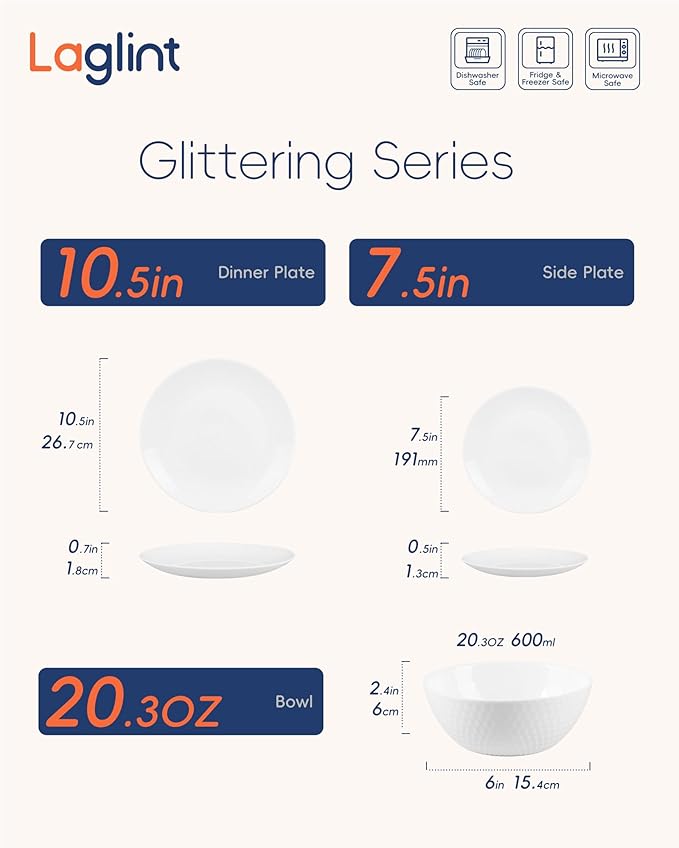 - What‘s in The Box: The 12-piece dinnerware set includes 4Pcs 10.5 in dinner plates, 4Pcs 7.5 in salad plates, 4Pcs 6 in (20 OZ) cereal bowls