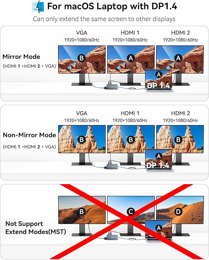 - 4K Dual Monitor & Triple Display: The docking station can easily to achieve dual-monitor and triple-monitor displays for Windows. Single use HDMI port up to 4K@60Hz, VGA port up to 1080p@60Hz. Extend 2 monitors (HDMI+VGA): 4K@60Hz + 1080p@60Hz; (HDMI 1+HDMI 2): 4K@60Hz + 1080p@60Hz. Display output will be 1080p@60Hz when triple display. Note: macOS only supports mirroring mode (SST).