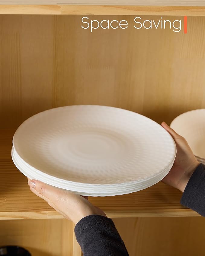 - Easy to Clean & Safe for Everyday Use – A slight odor or fine particles may appear when first opening due to the protective glass coating; simply rinse before use and enjoy odor-free, crystal-clear plates. Designed with a non-porous, ultra-hygienic surface, they require less detergent and energy to clean, and are dishwasher, microwave, and refrigerator safe