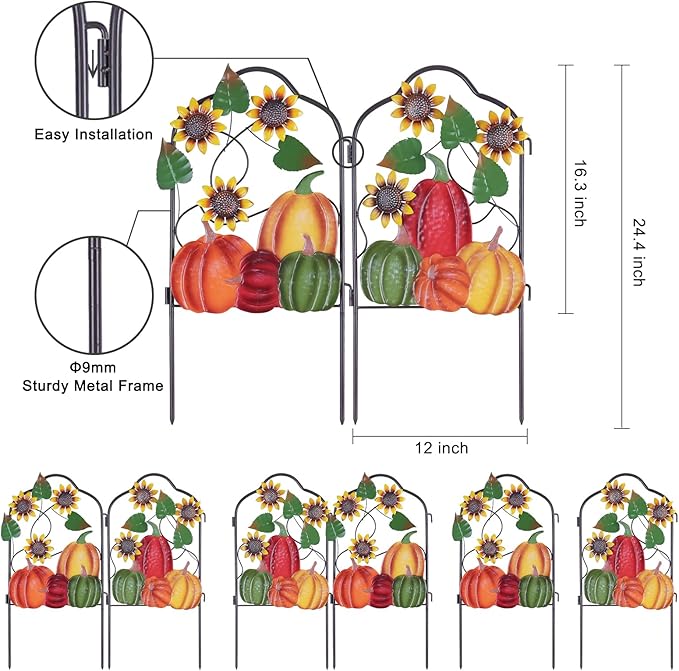 - đăFall Outdoor Garden Fence DecorăElevate your autumn landscape! The set of 2 arch shape design metal stakes features colorful pumpkins, sunflowers with vines & leaves. Perfect for adding festive charm to backyard or porches. Connect multiple sets to create a continuous fall border around flower beds or pathways. Transform your outdoor space into a cozy fall haven that welcomes guests and celebrates the season!
