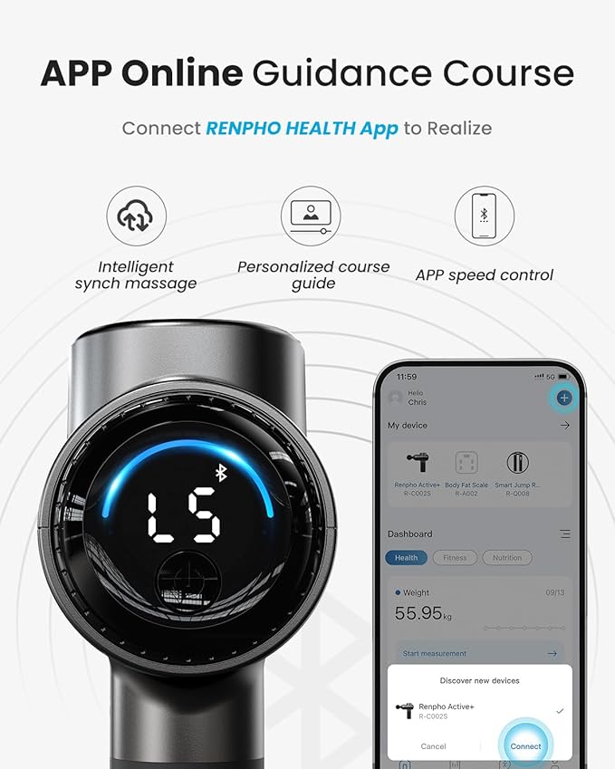 - Smart Personal Muscle Therapy: Connect the deep tissue massage gun to Renpho Health app via Bluetooth to access professional video courses tailored for specific muscle groups, synchronize your massage, control speed levels, and track your massage history