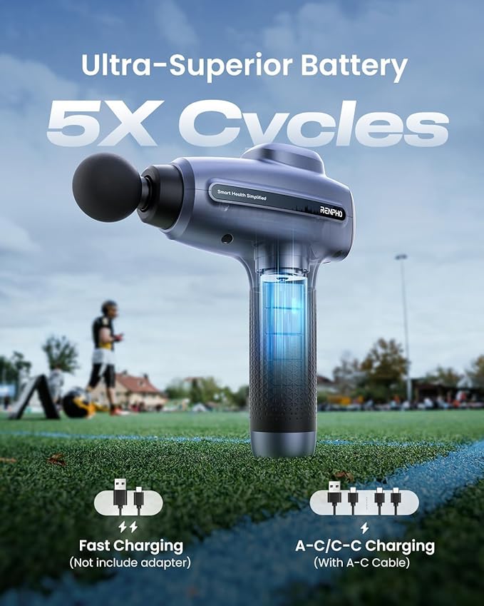 - Fast Charging & Type C Charging:RENPHO Massage Gun quickly recharges, providing uninterrupted relief whenever you need it. It is powered by a long-lasting rechargeable battery and supports USB A-C or C-C cable (C-C cable not included).