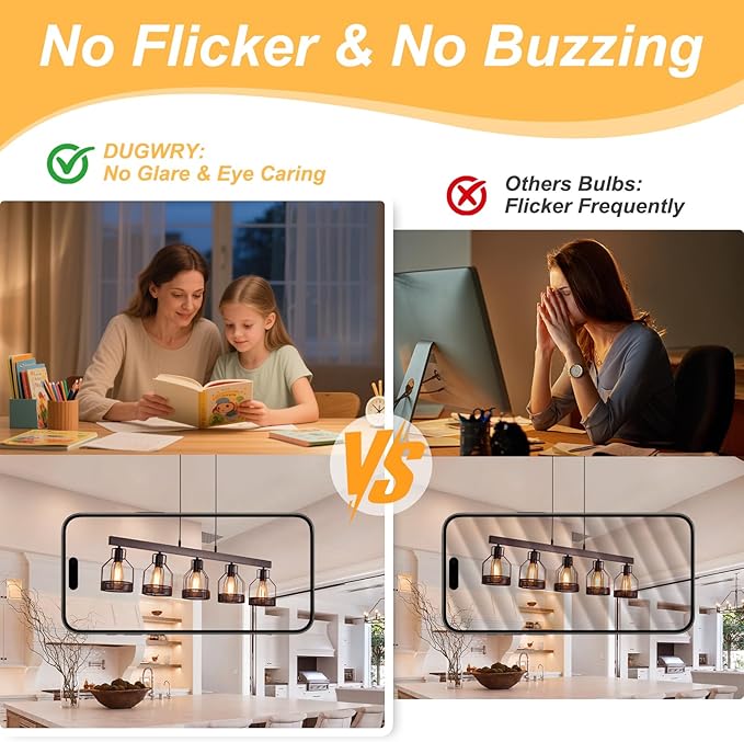 - 【Premium Durability】DUGWRY LED filamen bulbs feature a high-grade filament structure that ensures superior durability. The shock-resistant glass withstands vibrations, making them ideal for use in ceiling fans and other environments where movement is common.,Premium-grade filament structure with shock-resistant glass withstands ceiling fan vibrations, rated for 20000 hours ,about 13.7 years at 3hrs/day.