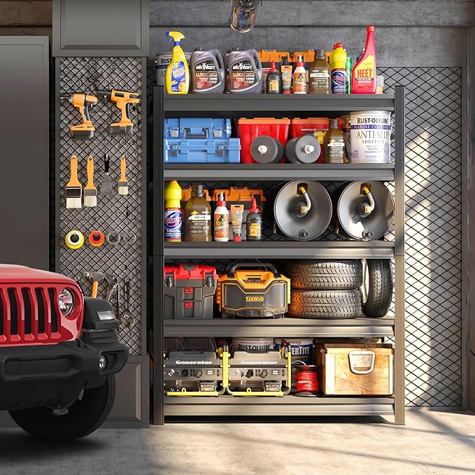 - 【Heavy-Duty 2500 lb Capacity】 Constructed with industrial-grade steel and reinforced crossbars, this 5-tier shelving unit supports up to 500 lbs per shelf (even distribution), ideal for storing heavy tools, automotive parts, or warehouse inventory without bending or wobbling.