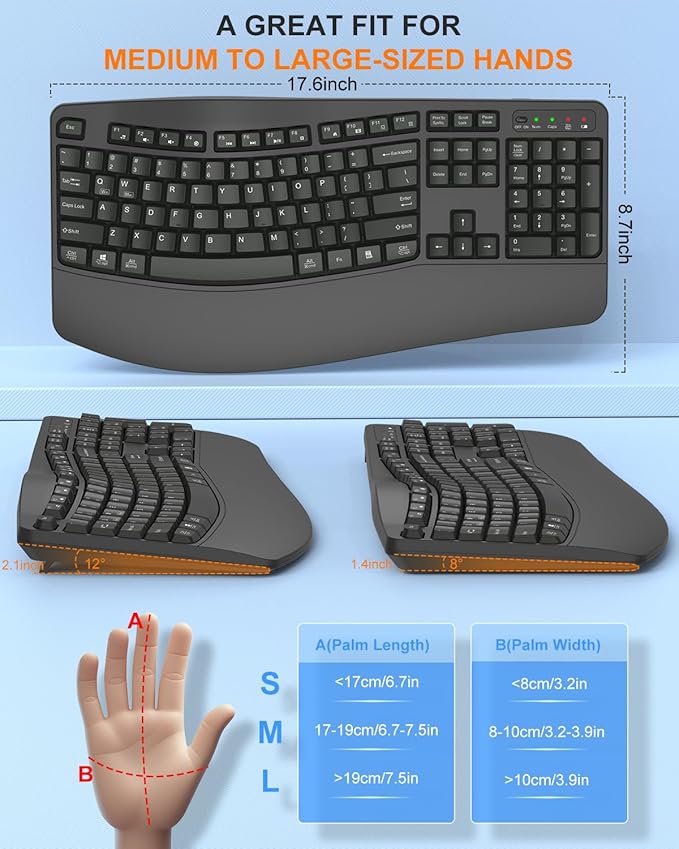 - ใ๐๐ข๐๐ ๐๐๐ฅ๐ฆ ๐๐๐ฌ๐ญ ๐ ๐จ๐ซ ๐๐ซ๐ ๐จ๐ง๐จ๐ฆ๐ข๐ ๐๐ฎ๐ฉ๐ฉ๐จ๐ซ๐ญใThis ergo wireless keyboard is very suitable for medium to large-sized hands. The wide palm rest supports your wrists, allowing your hands to remain at the same level as the cordless keyboard without having to bend your palms or put more effort to keep them lifted, which reduces the stress during long typing sessions. You can also adjust the full size keyboard tilt as needed.