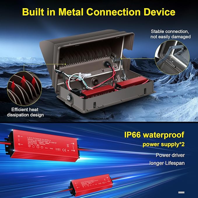 - IP65 Waterproof & Efficient heat dissipation:LED wall packlights is tightly fixed by 14 nuts and has a built-in waterproof ring. It has undergone 5 hour rainstorm simulation test. The front&rear covers of the wall light adopt deep buried design and ultra wide waterproof layer to achieve outdoor IP65 waterproof. The high and low distribution of built-in heat sinks improves heat dissipation efficiency, resulting in a lifespan of over 50000H+. The high-quality structure reduces maintenance costs.