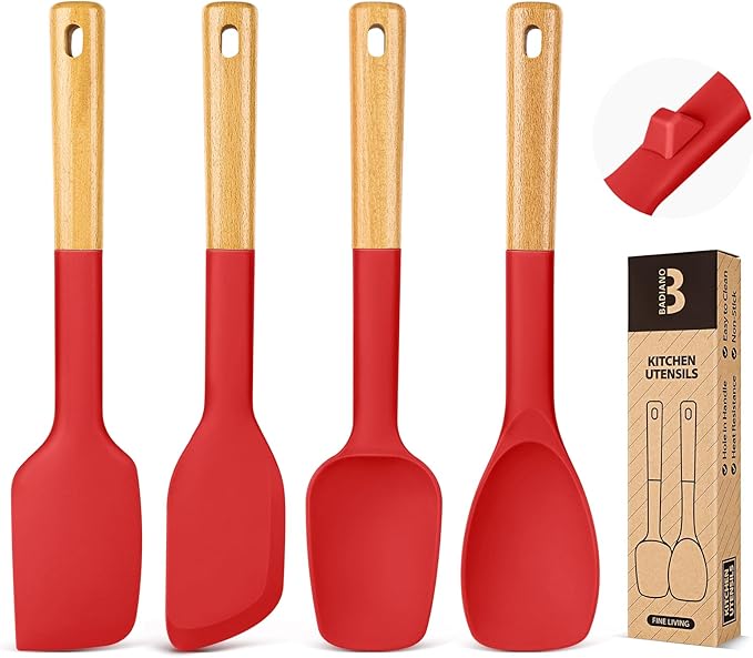 Silicone Spatula Spoon Set, Great for Mixing, Folding, Scraping, and Spreading, Sturdy BPA-Free Matte Silicone, Wooden Handle Rubber Spoonula for Nonstick Cookwares,4 Pack (RED)