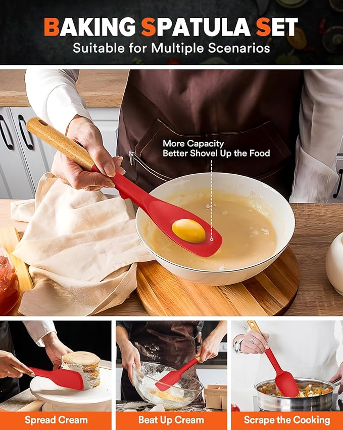 - Multi-Functional Kitchen Essential: Heat-resistant 446℉ (230℃) silicone spatula, scraper, spoonula, and mixing spoon—effortlessly tackle baking, frying, sauces, and everyday cooking with scratch-free precision