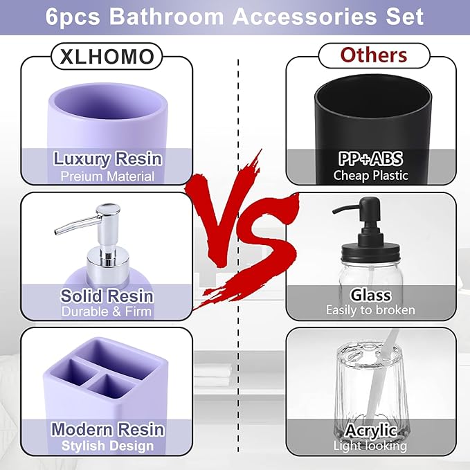 - RESIN PURPLE BATHROOM ACCESSORIES SET COMPLETE - Our bathroom set includes 1 x soap dispenser, 1 x toothbrush holder, 1 x vanity tray, 1 x bathroom tumbler, and 2 x apothecary jars. A complete set of all-in-one bathroom essentials that are easily accessible!