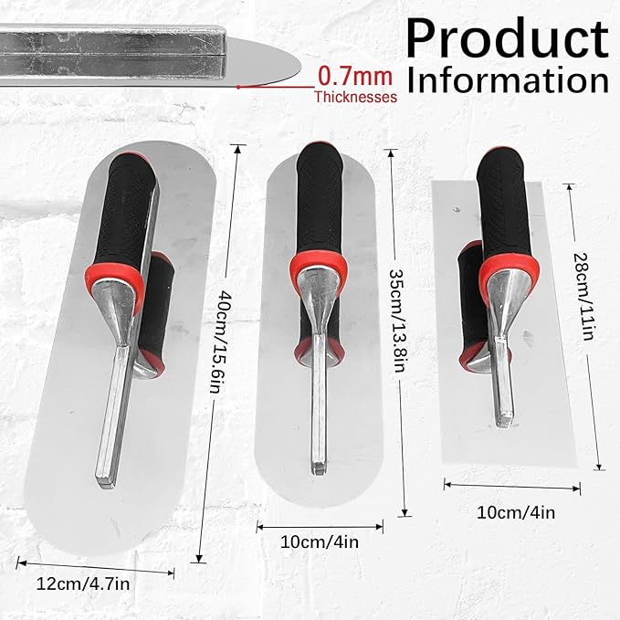 - 【CONCRETE TOOLS SET】You will get 3 pieces of concrete finishing trowels, including 1pcs flat finishing trowel ( 11” x 4” ) and 2 pcs pool trowels ( 14” x 4” and 16” x 5”), different sizes to meet your different requirements will make your work easier and more efficient