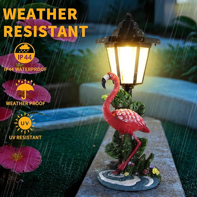 - Unique Flamingo Design: This funny statue features a vibrant flamingo standing under a classic black lantern and surrounded by tropical foliage! Its lifelike details and vibrant colors bring a vibrant tropical feel to your garden. The Flamingo garden statue measures 4.7"L x 4.5"W x 13.2"H.