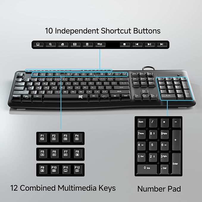 - Multi-function USB Keyboard: This multimedia USB PC keyboard comes with a numeric keypad, 10 independent shortcut keys, and 12 multimedia combination keys (including video, volume, Internet, email, etc.), which can enhance your workflow and simplify the way you use your computer.