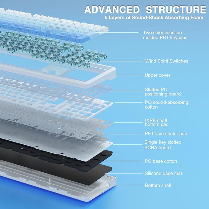 - Advanced Five Layers Filling Structure: The mechanical keyboard wireless features an advanced structure, extended integrated silicone pad and PCB single key slotting, better optimizes resilience and stability, making the hand feel softer and more elastic. Five layers of filling silencer fills the gap between the PCB, the positioning plate and the shaft, effectively counteracting the cavity noise sound of the shaft hitting the positioning plate, ensuring the purest sound and soft and smooth typing experience every time you press the key