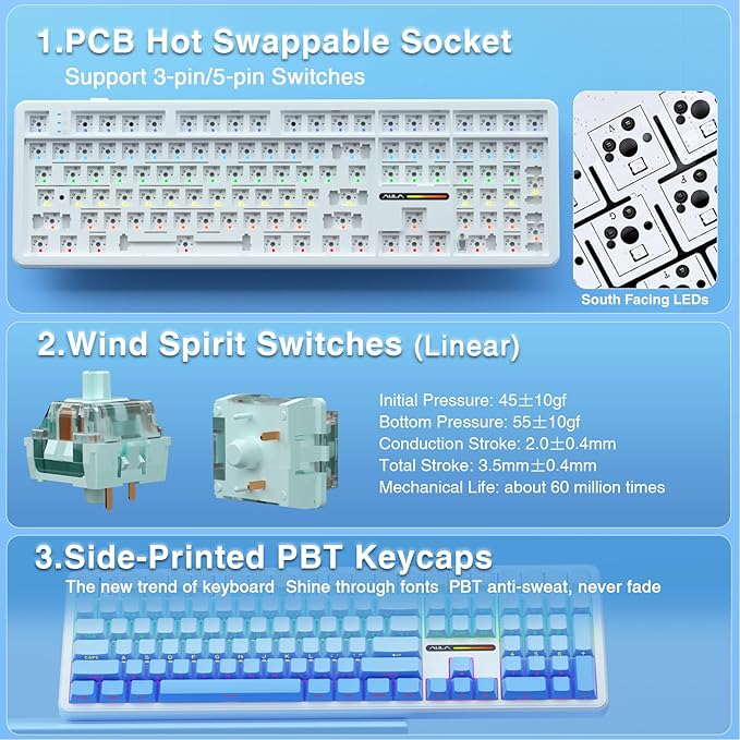 - Hot-swappable Custom Keyboard: AULA F108 wireless mechanical keyboard comes with a hot-swappable base that is compatible with 3-pin or 5-pin switches. Without the soldering process, users can easily replace switches and keycaps to customize their keying experience (keycap/switch puller is included in the package). Equipped with pre-lubricated stabilizers and switches, the creamy keyboard bring smooth typing feeling and pleasant creamy mechanical sound, providing fast response for exciting games