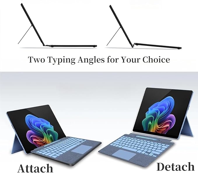 - 【Adjustable Angle】You can adjust your microsoft keyboard at different angles for more comfortable typing and viewing. surface pro keyboard can detach or attach a more ergonomic typing angle through magnetic adsorption.