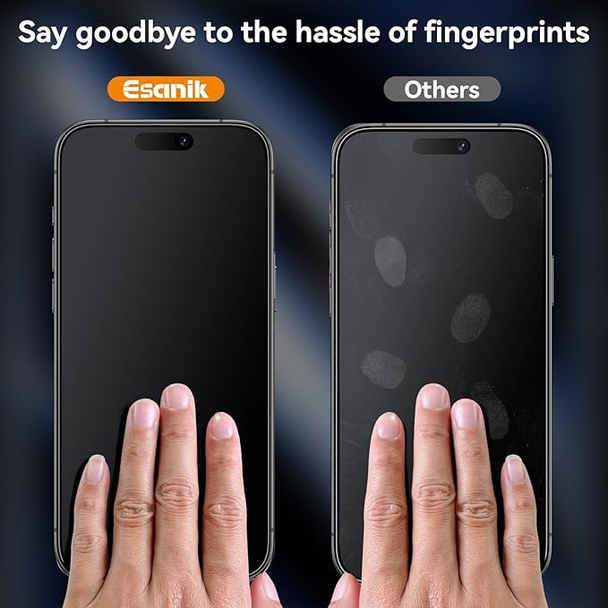 - [Auto-Alignment for Effortless Installation] Esanik's auto-alignment installer is meticulously crafted for the iPhone 15 Pro, featuring auto-alignment technology that ensures a bubble-free application. In just moments, our matte screen protector seamlessly adheres to your device, eliminating the frustration of tricky installations. Say goodbye to the hassle and hello to effortless protection for your iPhone.