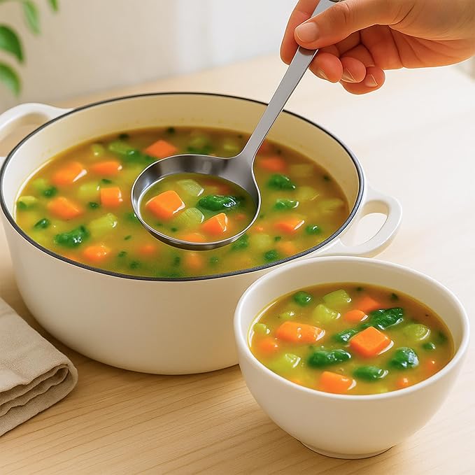 - Deep Bowl for Efficient Serving: Features a generously sized, polished bowl to scoop and pour liquids smoothly, reducing spills and making the stainless steel ladle ideal for large pots, stockpots, or serving dishes.