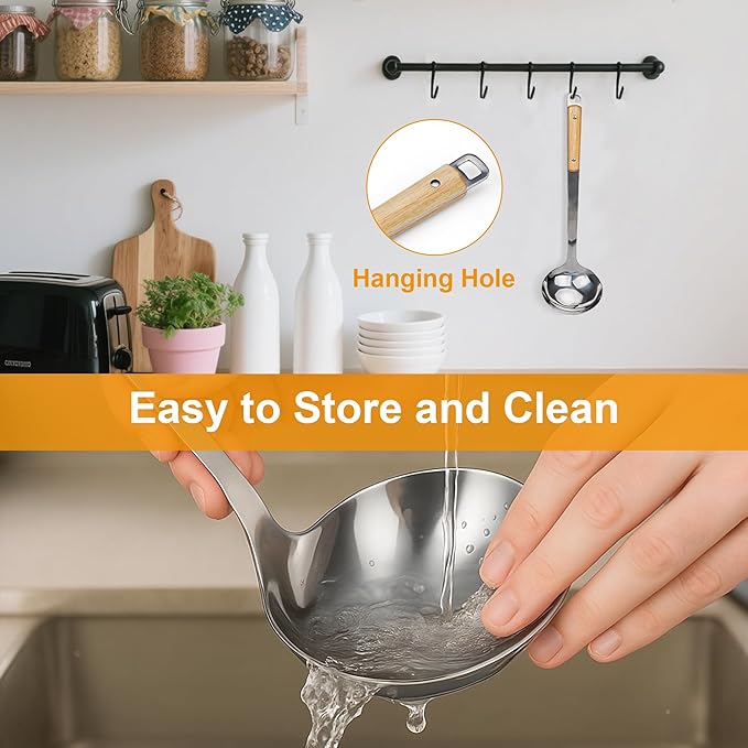 - Premium Wok Ladle : Crafted from high-quality, food-grade 18/8 stainless steel, this soup ladle resists rust, corrosion, and stains, ensuring long-lasting durability for daily use in soups, sauces, or batters.