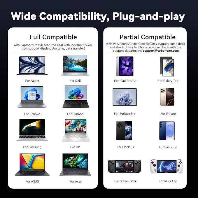- Wide Compatibility and Versatile Applications: It is fully compatible with full-featured Windows laptop and MacBook(including Dell, HP, Lenovo, Surface, Asus, Acer, MacBook Pro, MacBook Air), It also partially compatible with iPhone 15 series, Type-C mobile phones, Steam Deck, Mac mini, iPad, etc., meeting the device connection needs of different users. It features a plug-and-play design, just plug in the device and start using it. It's convenient for enhancing work efficiency anytime, anywhere