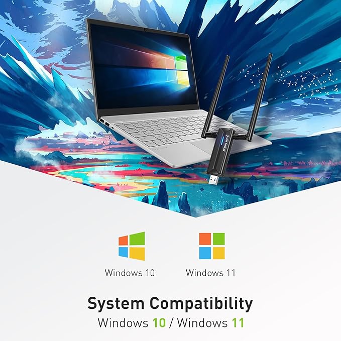- đ ăWide CompatibilityăThe AX3000Mbps WiFi 6e Dongle is designed for seamless compatibility with desktops and laptops running Windows 10 (64-bit) and Windows 11 (64-bit). It supports 802.11 ax/ac/a/b/g/n devices, ensuring a hassle-free setup. Note: 6GHz support is available only on Windows 11 with a compatible router.