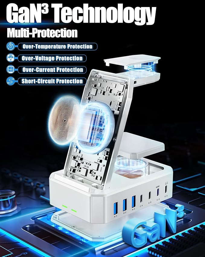 - 【Safe Charging&Multiple Protection】: Our Dual 65W PD usb c fast charger dock is equipped with the latest intelligent and efficient chipset with GaN III technology to ensure fast and safe powering of your devices. Ready to charge your Macbook series and other laptops. Our phone and watch charging station features over-current, over-voltage, over-temperature and over-charging protection. The internal circuitry is designed to prevent overcharging from damaging your device, ensuring safe charging.