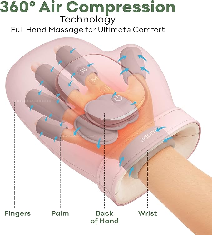 - 360° Air Compression & Acupressure Relief: Experience comprehensive hand care with Adomii’s hand massager’s 9 compression airbags that apply rhythmic acupressure to soothe fingers, palms, and wrists, easing arthritis pain for all-day comfort and relief.