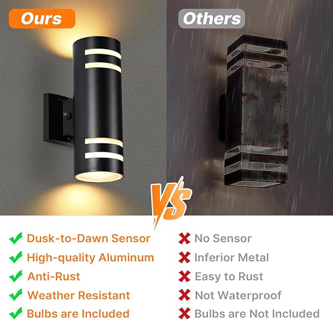 - 【Upgraded Integrated Outdoor Wall Sconce】This outdoor wall light is equipped with an advanced intelligent light-sensing control system, which can accurately sense changes in the surrounding light. They will automatically turn on at night and off at dawn without manual operation, providing you with a convenient lighting experience.