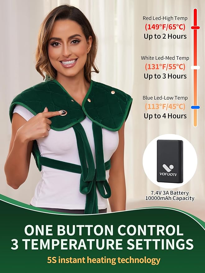 - 5s Instant Heating Technology: Vofuoti battery operated heating pad with a 10000mAh battery to easily switch between 3 heat settings, allowing you to enjoy effective heat at different temperatures, that runs for up to about 4 hours on Low setting, 3 hours on Medium, and 2 hours on High. (You can get an extra battery from our store if you need more heating. ASIN: B09CPXFTCP)